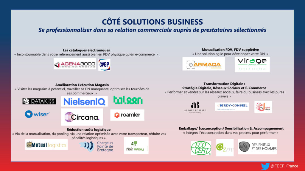 L’opportunité pour les PME de rencontrer des prestataires de services sélectionnés (catalogues électroniques, mutualisation Force de Vente, amélioration exécution magasin, réduction coûts logistiques, stratégie digitale, réseaux sociaux, ecommerce, emballages et éco conception). Ceux-ci proposent des solutions business accessibles aux PME et avec une tarification spéciale pour les adhérents FEEF.