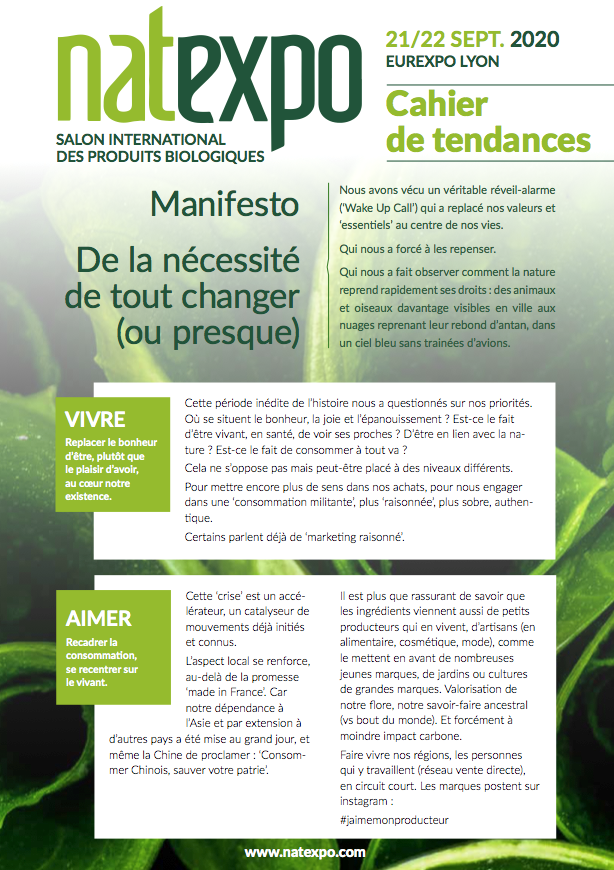 Natexpo est le lieu de rendez-vous de toutes les dernières tendances de la bio. Plus de local, plus sain, plus de partage : les consommateurs recherchent toujours plus d’engagement de la part des marques. Du sourcing green au packaging, tout sera scruté. Certains exemples de marques et de produits des exposants Natexpo illustrent déjà ce nouveau monde, à retrouver dans le cahier de tendances Natexpo 2020.