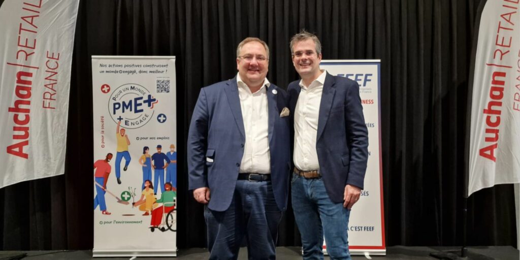 « Je suis très content d’être ici pour ce 10ème salon Auchan, merci aux équipes Auchan et Feef pour cette organisation. La FEEF c’est plus de 1000 adhérents alimentaire et non alimentaire et c’est aussi le label PME+, le label RSE des PME. 76 entreprises PME+ sont d’ailleurs présentes aujourd’hui. Malgré le contexte difficile pour les PME, leurs investissements progressent et l’emploi continue d’augmenter en nombre de salariés. Nous sommes en pleine turbulence mais nous nous projetons sur l’avenir. Concernant les négociations commerciales, la FEEF souhaite que les PME négocient avant les multinationales. Auchan a la meilleure part de marché en marques PME et je vous encourage à accélérer, c’est un gage d’avenir et de diversité pour le choix du consommateur. Auchan soutient le label PME+ avec une opération digitale qui a mis en avant 245 produits. Je vous souhaite à tous de belles rencontres! » Léonard Prunier.