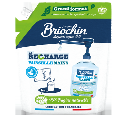 « La recharge 450ml Savon Noir Algues Marine est la première référence du portefeuille vaisselle & main de Briochin.