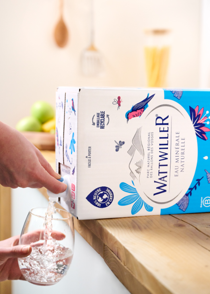 Nous avons une stratégie de packaging durable qui vise à baisser notre empreinte carbone et à favoriser une économie circulaire. Le lancement de la fontaine d’eau minérale Wattwiller en carton en est la parfaite illustration. Cette innovation permet de réduire les émissions de carbone de 40% et de baisser l’empreinte plastique de 60% au litre en comparaison d’un pack de 6x 1.5l PET classique.